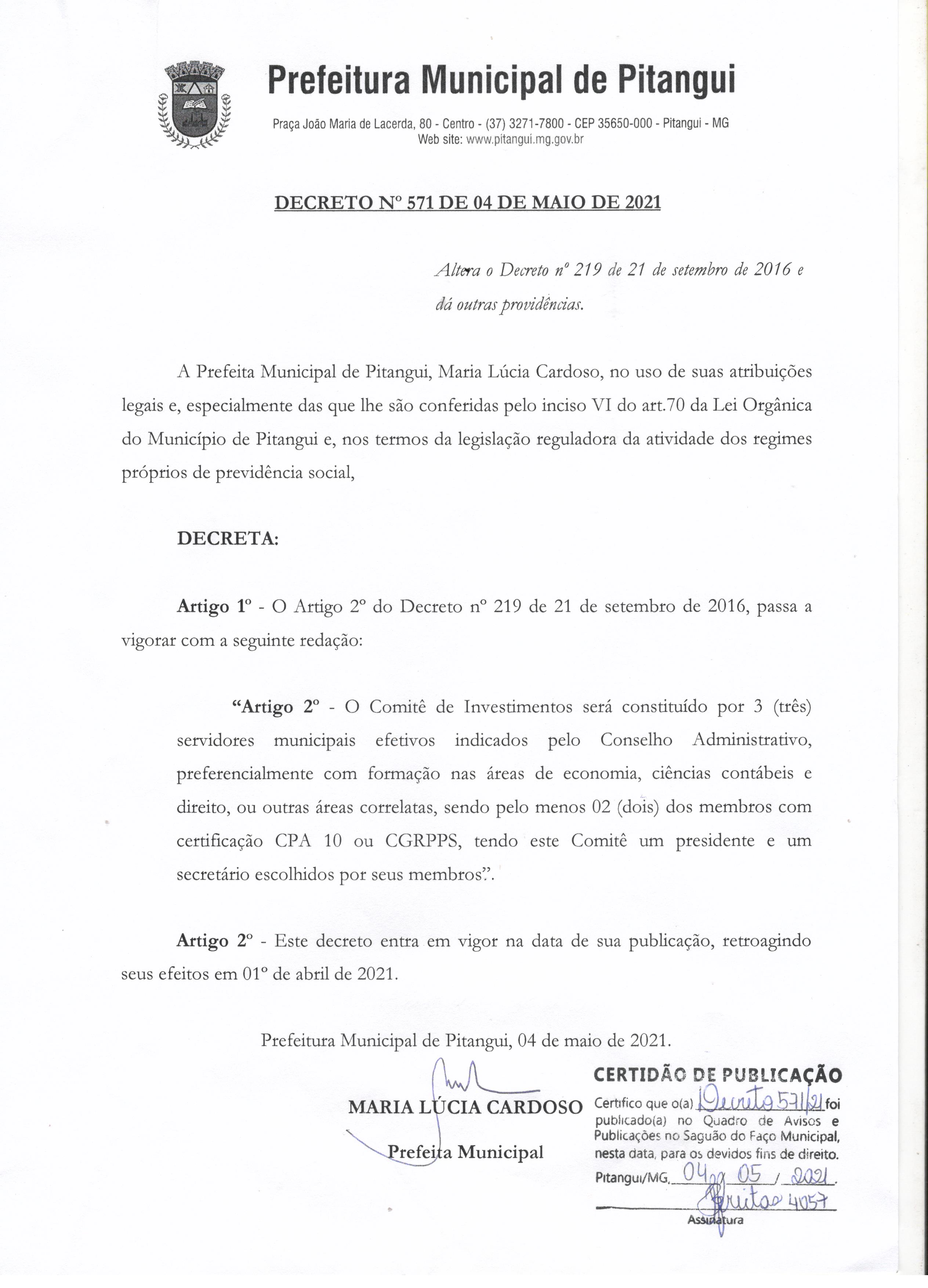 Decreto Nº 571/2021- Altera o Decreto Nº1'9 d 21 de Setembro de 2016 e dá outras providências